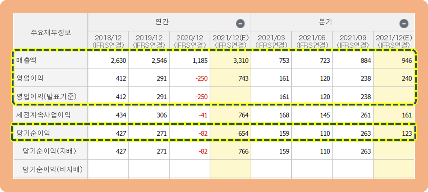 그래도 다행인건, 앞서 말씀드렸듯이 2021년에는 계속해서 호실적을 기록하고 있기 때문에 2021년 연간 실적은 큰 폭으로의 흑자 전환에 성공할 것으로 예상되는 상황입니다.