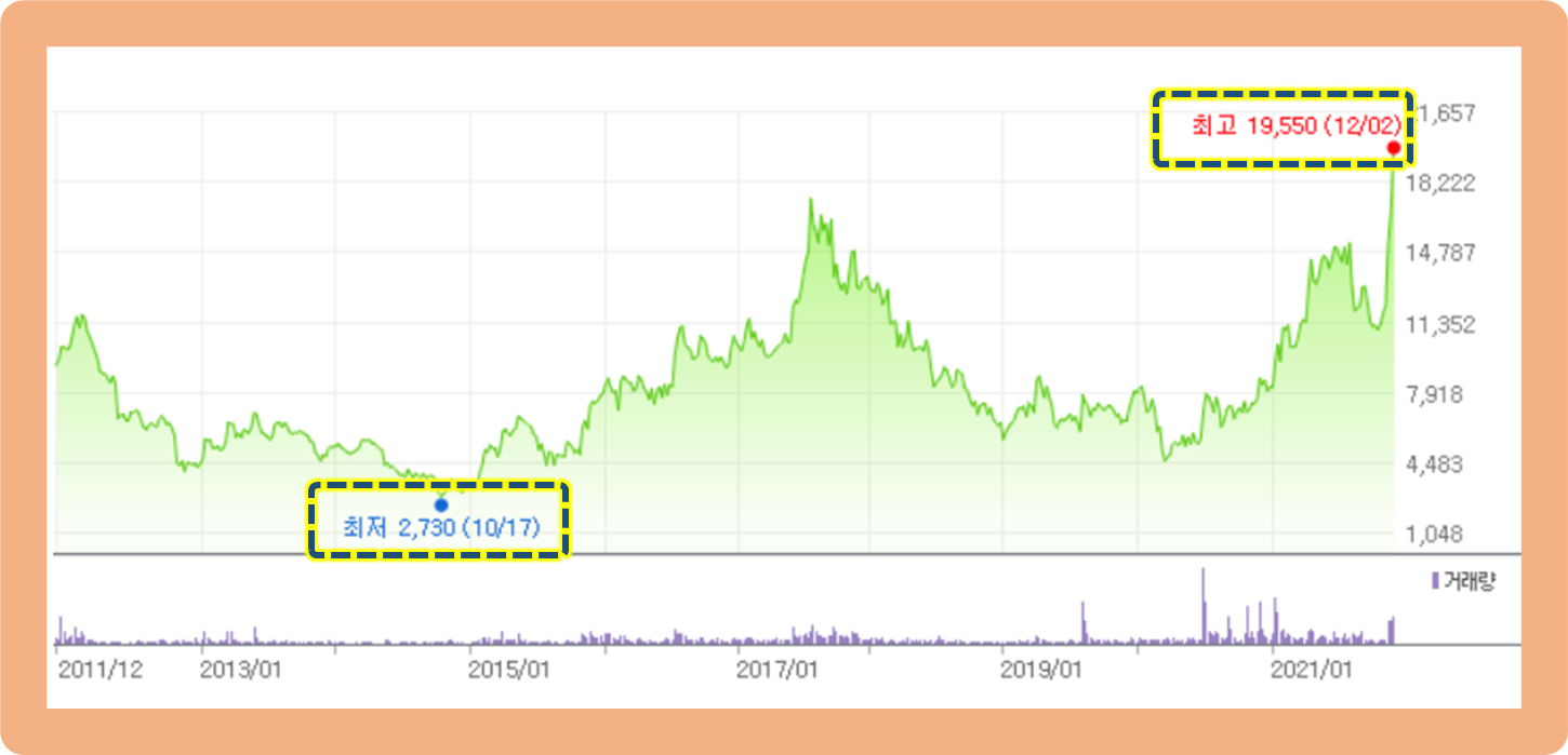 최저가는 지난 2014년 10월에 기록한 2,730원이며, 최고가는 2021년 12월에 기록한 19,500원입니다.