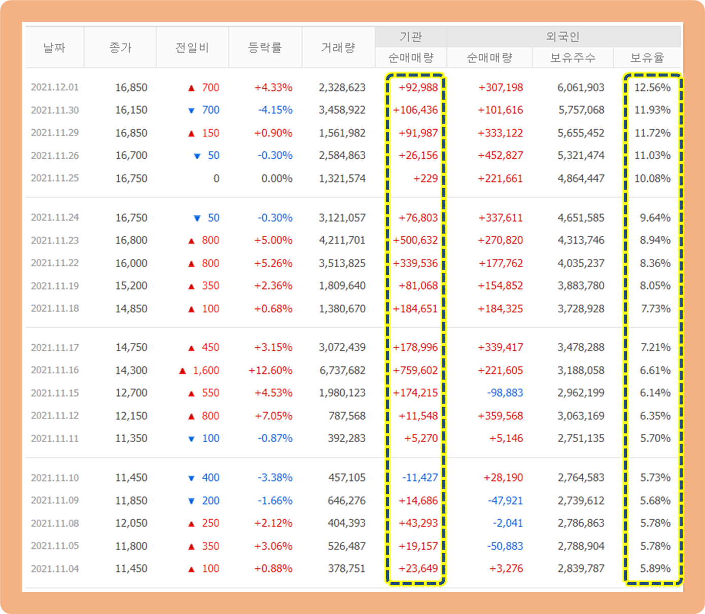 기관투자자의 경우부터 보시면, 꾸준히 대량으로 매집하고 있는 모습을 보이고 있습니다.