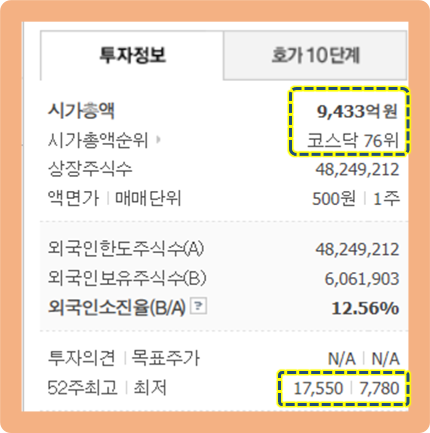 52주 최고가는 17,550원이며, 52주 최저가는 7,780원이네요.