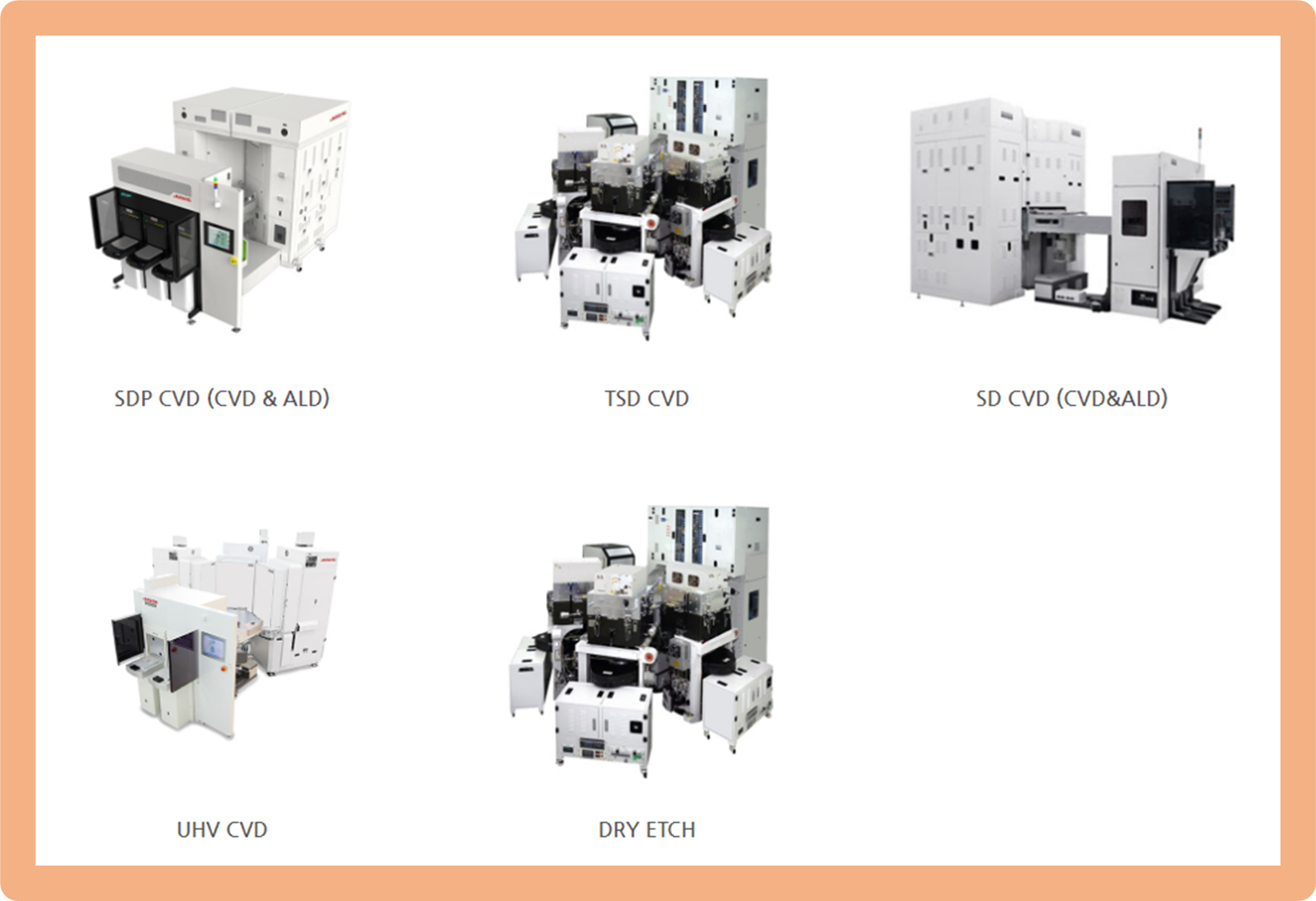 주력 제품으로는 HDP CVD,SD CVD 등의 반도체 장비, PE CVD 등 LCD장비, 고효율 태양전지 등이 있구요.