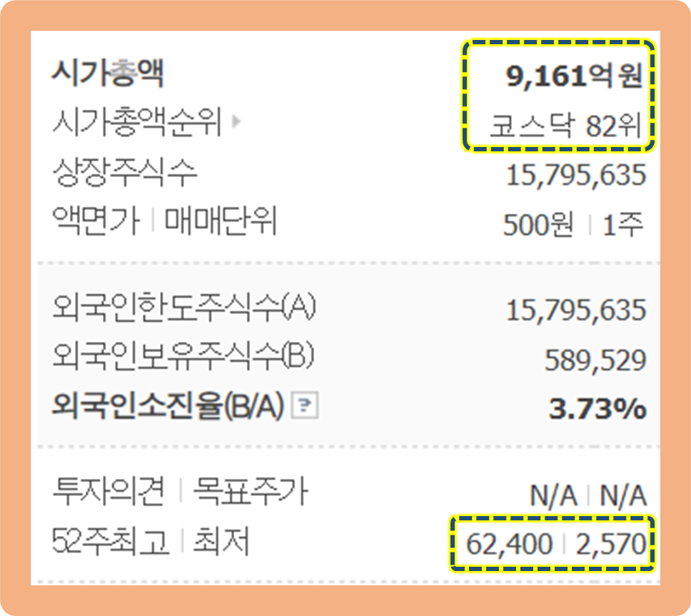 52주 최저가는 2,570원, 52주 최고가는 62,400원으로 무려 1년 동안 주가 변동률이 30배 이상 차이나네요.