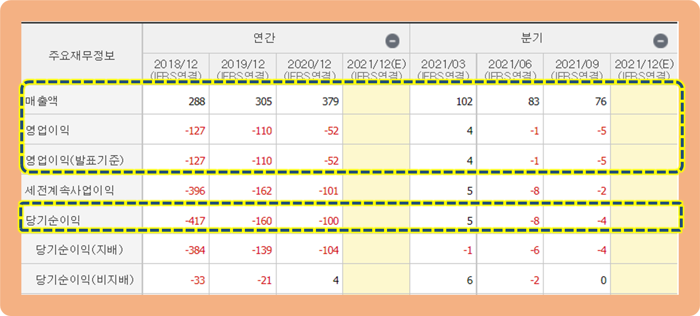 또한 수년 간 순손실을 기록하면서 적자 행진을 이어나가고 있지만, 최근 꾸준한 매출액 상승과 함께 손실을 큰 폭으로 줄여나가는 모습을 보여주고 있죠.