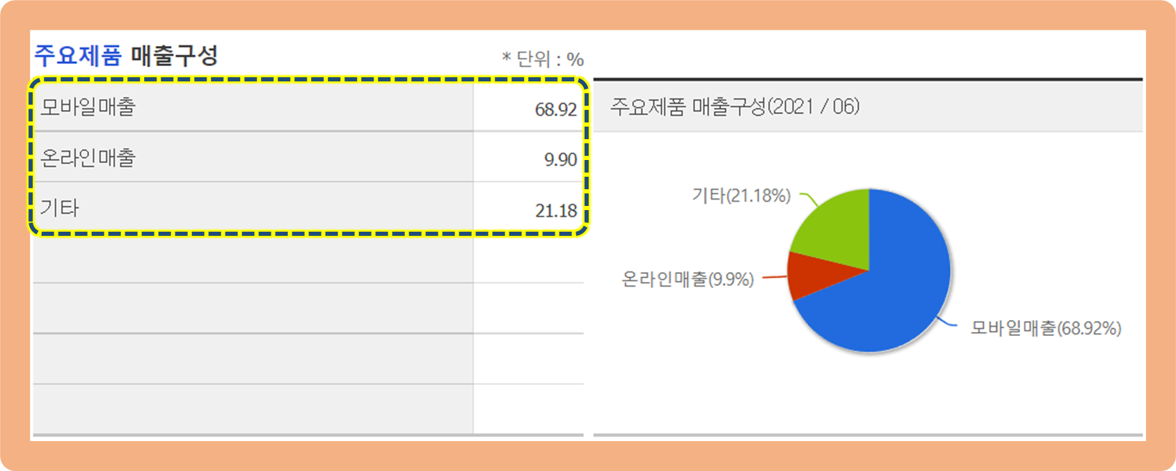 모바일게임 부문 매출이 약 68.9% 수준으로 매출 전반을 책임지고 있구요.