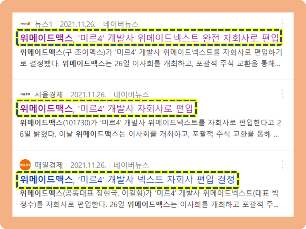 2021년 11월 26일, 위메이드맥스가 위메이드넥스트를 자회사로 완전히 편입하기로 결정했다는 소식이 발표되었습니다.