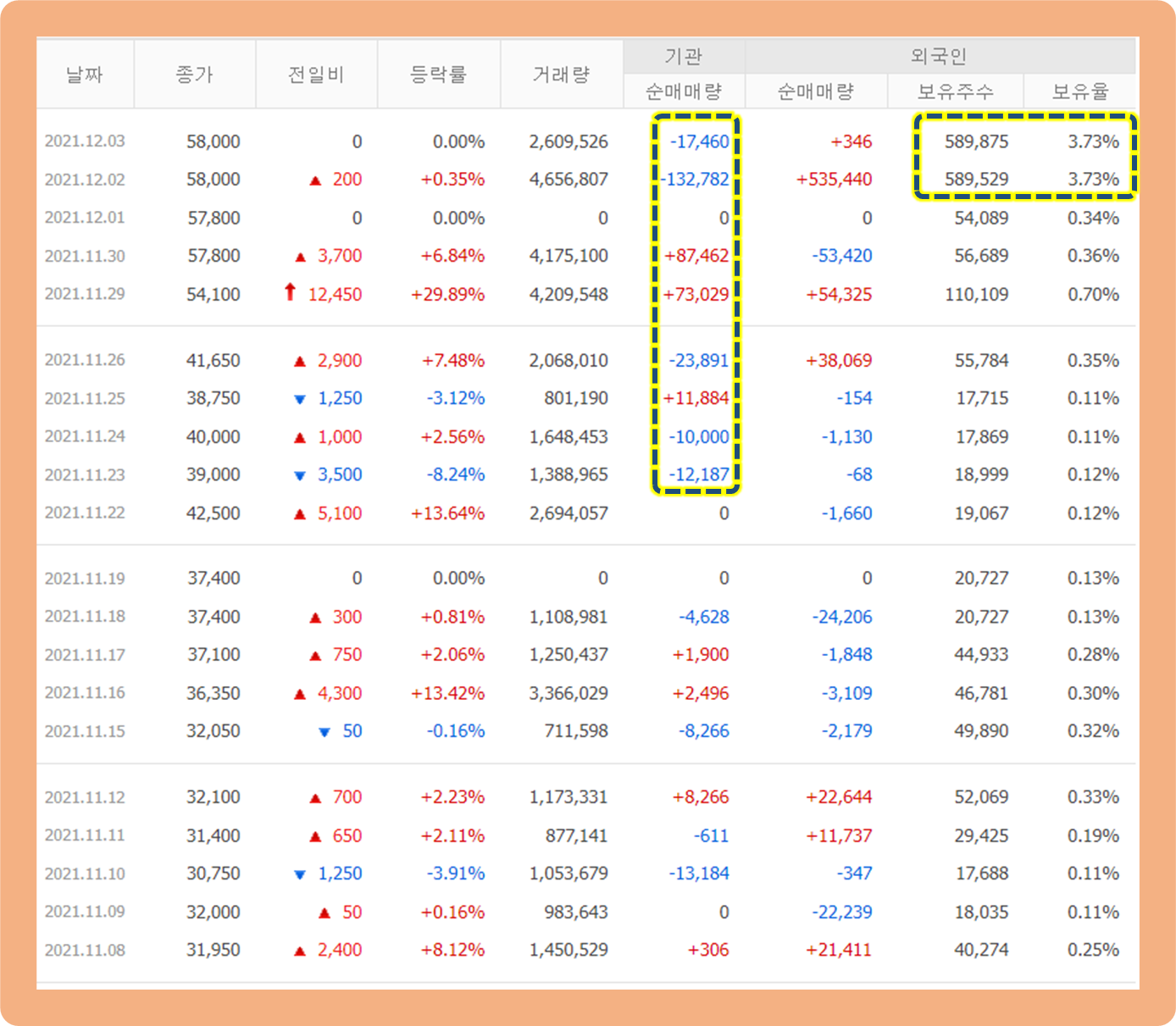 최근 들어 기관 투자자의 거래량이 많이 늘어났는데요. 매수세보단 매도세가 조금 더 우위를 점하고 있는 모습입니다.