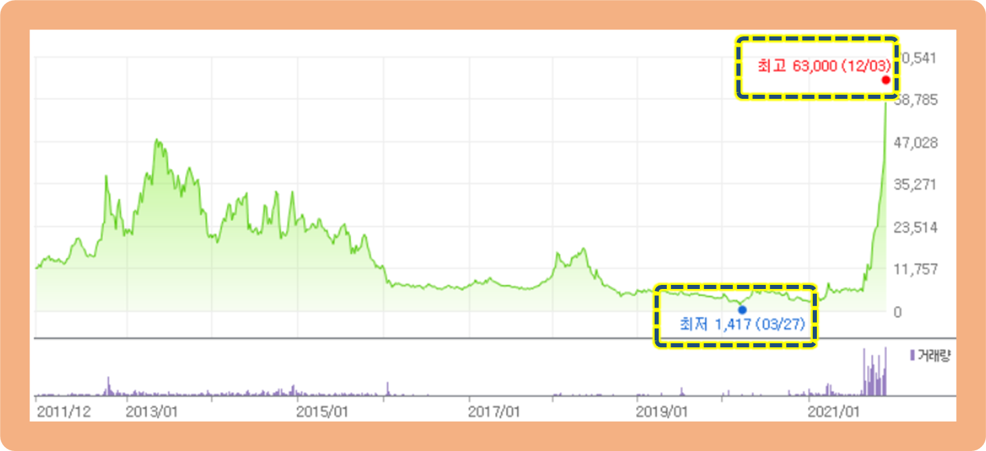 최저가는 2020년 3월에 기록한 1,417원이고, 최고가는 2021년 12월에 기록한 63,000원이네요.