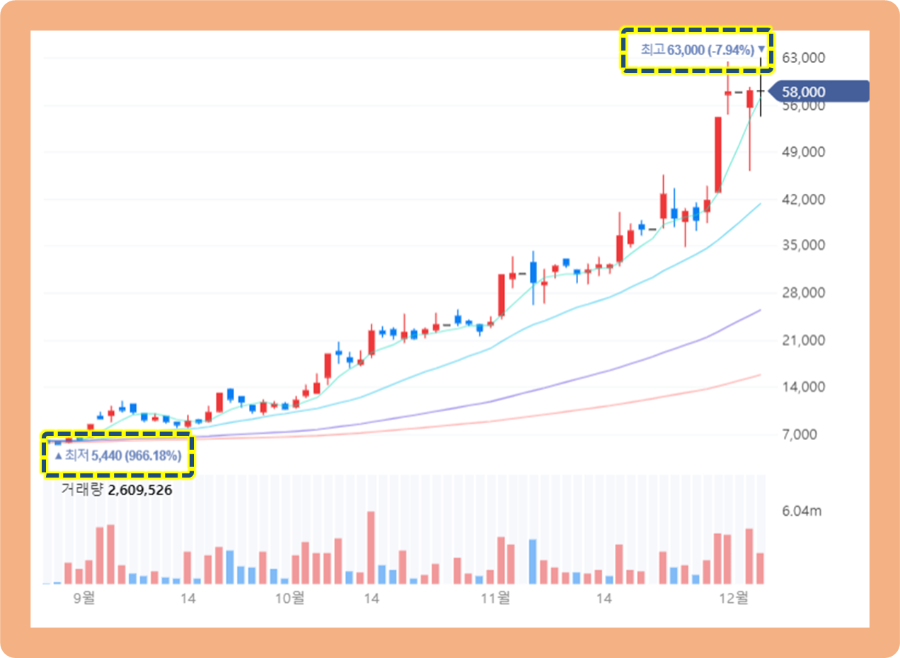 그리고 12월 3일 기준으로 최고 63,000원까지 터치해버린 상황이네요.