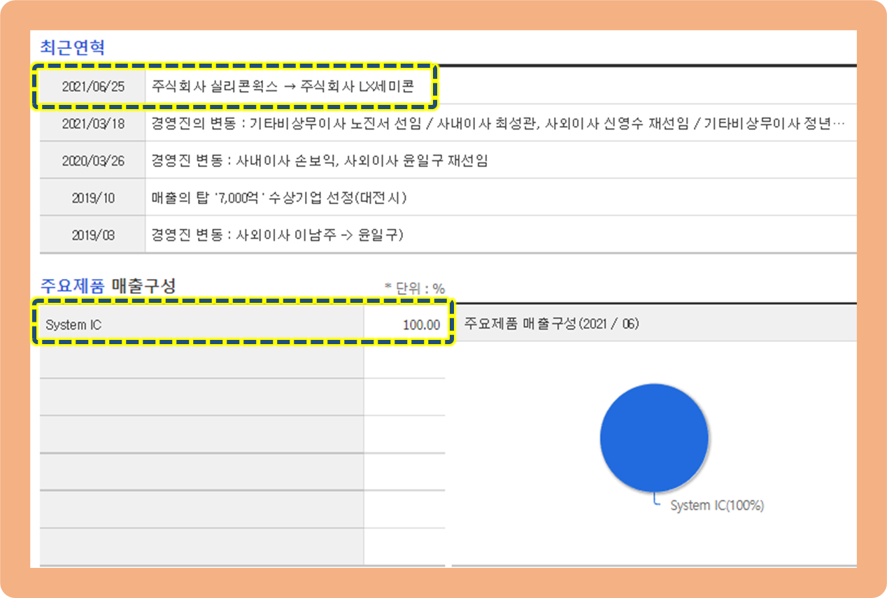 LX세미콘의 최근 연혁 및 주요 제품 매출 비중을 살펴보도록 하겠습니다.