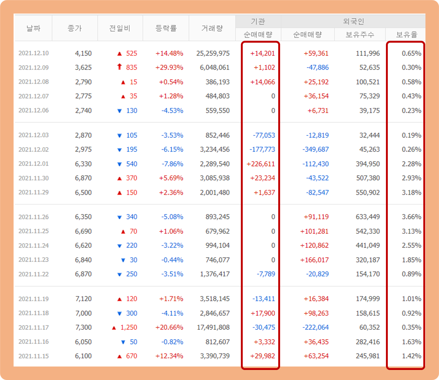 지난 2021년 11월 17일, 며칠 간 강세를 이어오다가 주가는 약 3천원 후반대까지 올라갔었는데요.