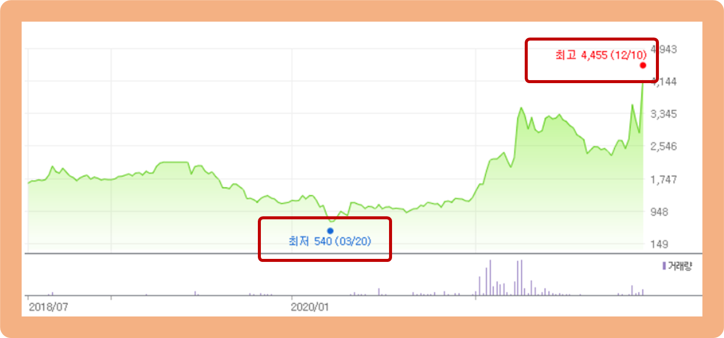 최저가는 2020년 3월에 기록한 540원이며, 최고가는 2021년 12월에 기록한 4,455원입니다.
