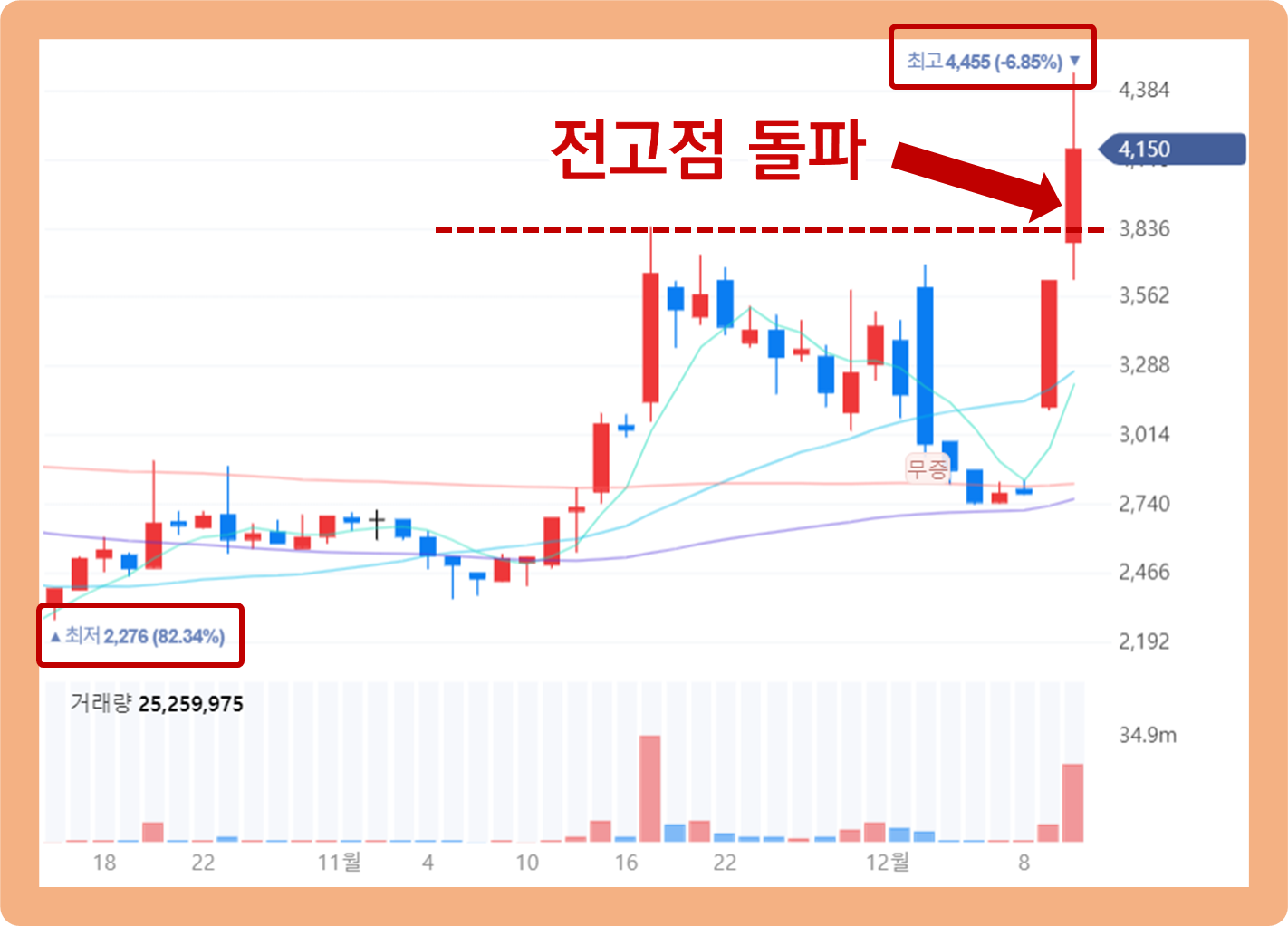 2021년 12월 10일, 직전 전고점 돌파와 함께 4,455원에 장을 마감했습니다.