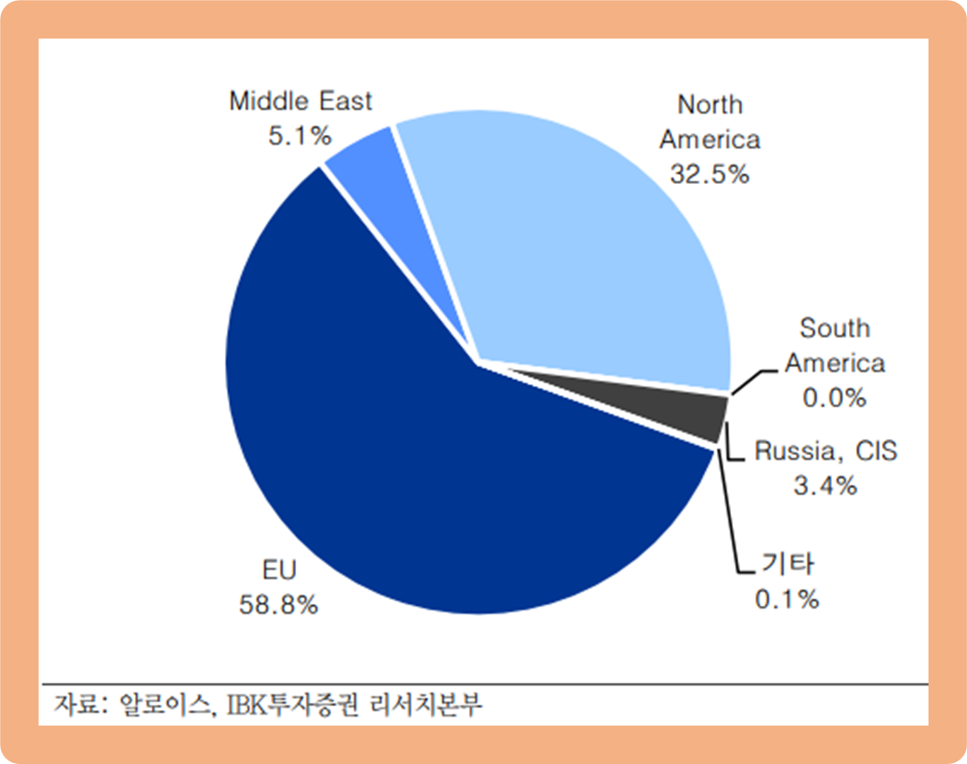 유럽이 58.8% 수준으로 절반이 넘는 부분을 차지하고 있으며, 그 다음으로 북미가 32.5%로 뒤를 이어오고 있습니다.