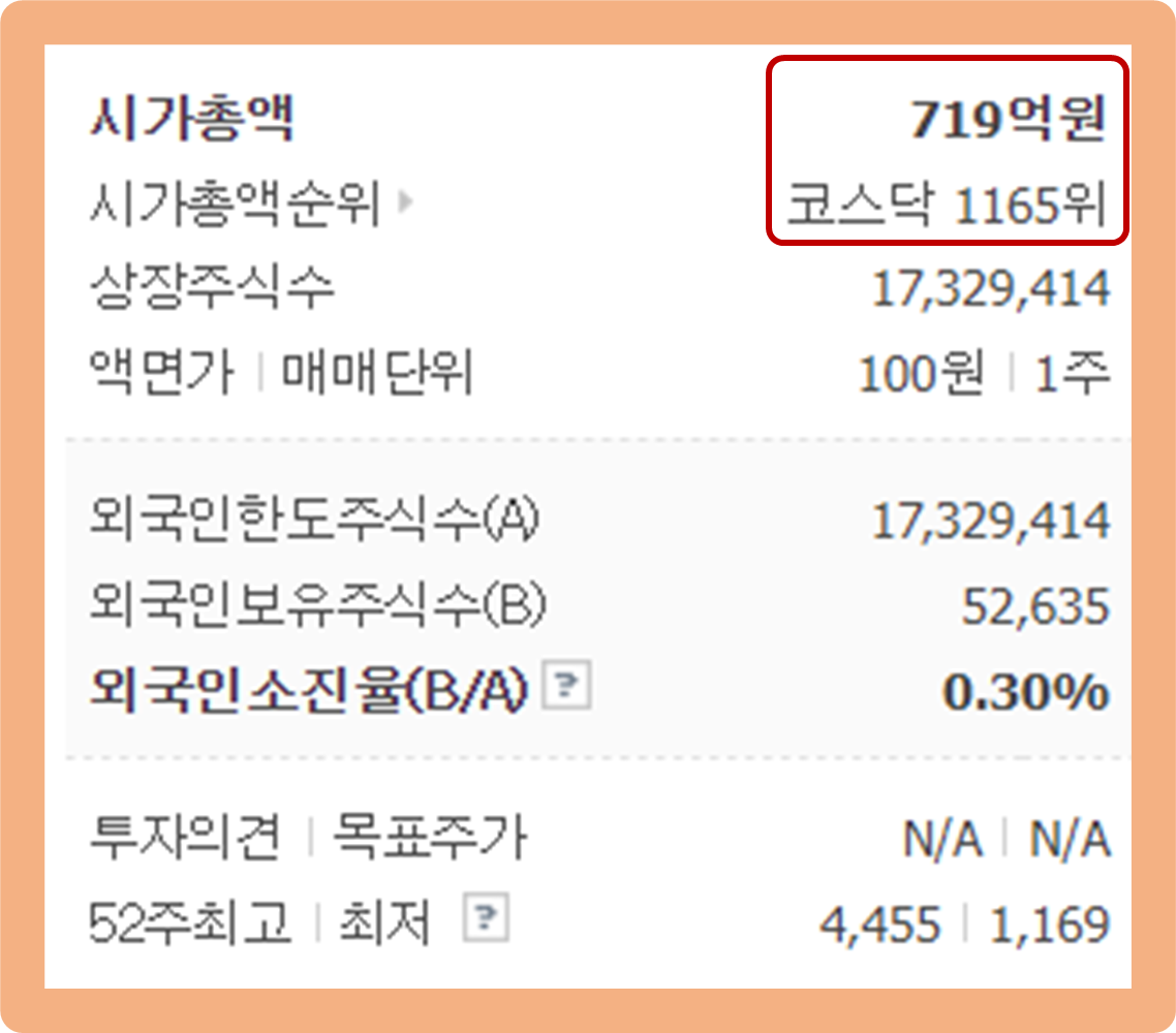 현 시가총액 약 719억원으로 코스닥 1165위인 기업이며, 52주 최고가와 52주 최저가는 각 4,455원, 1,169원이네요.