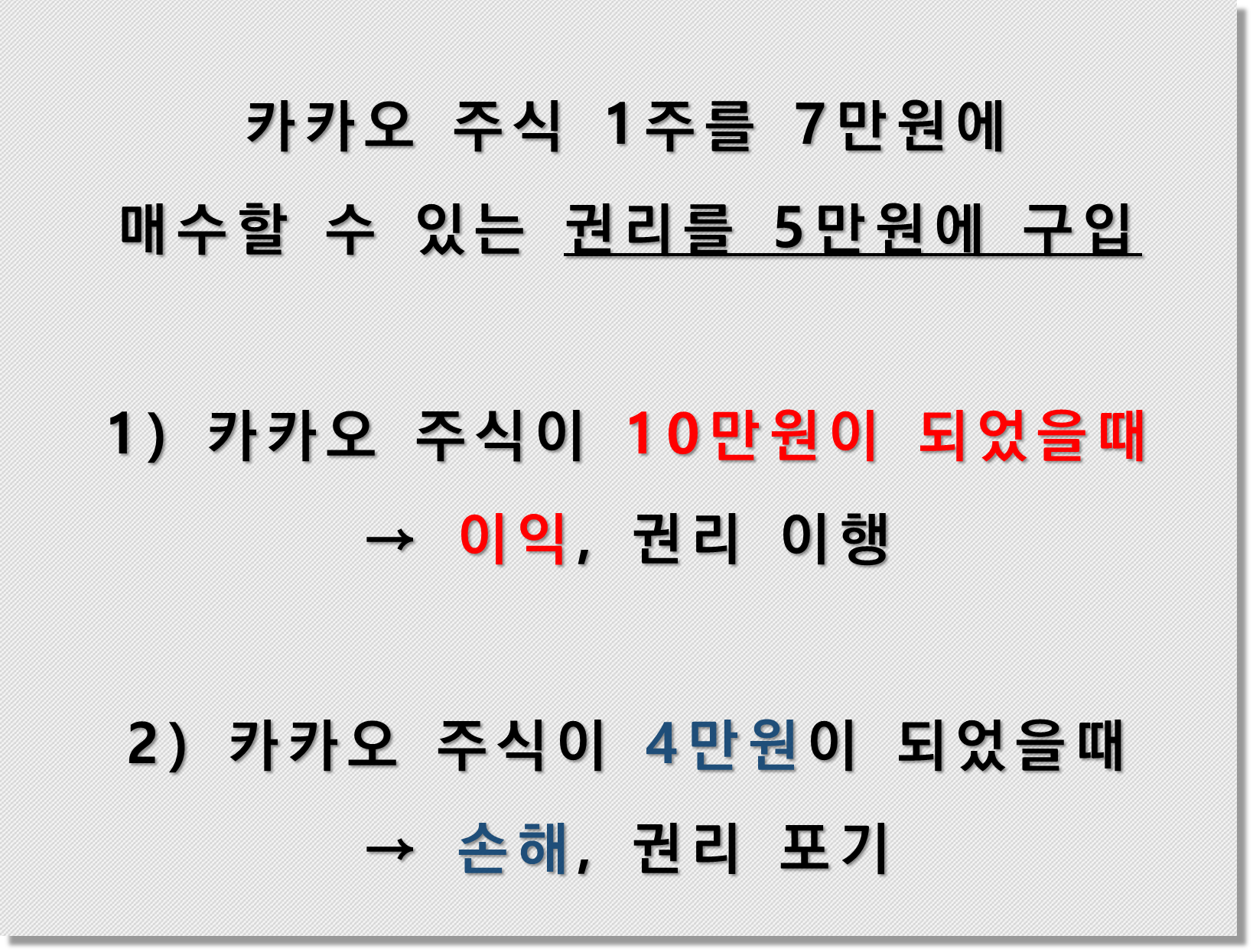 제가 카카오 주식 1주를 7만원에 매수할 수 있는 '권리'를 5만원에 구입했다고 가정해보도록 하겠습니다.