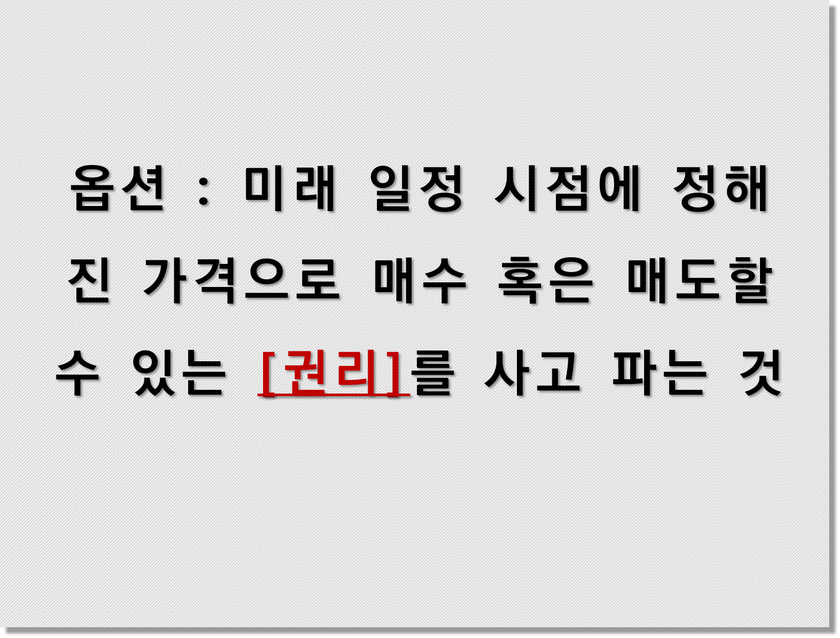 옵션이란, 미래 일정 시점에 정해진 가격으로 매수하거나 매도할 수 있는 '권리'를 사고파는 것입니다.