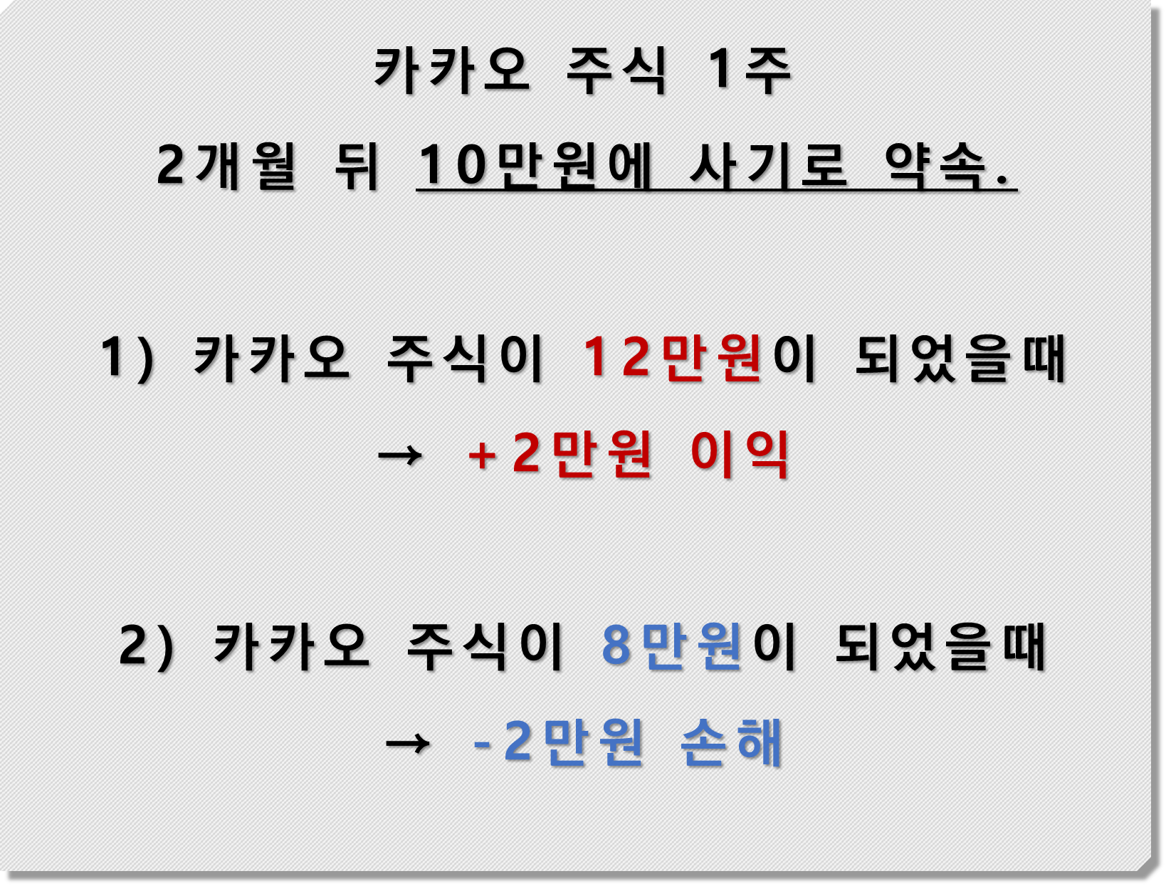 제가 카카오 주식 1주를 2개월 뒤에 10만원에 구매하기로 약속을 했다고 가정해보겠습니다.