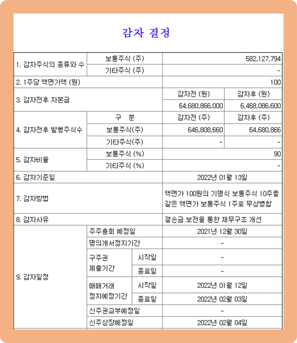 감자가 완료되면 판타지오 자본금은 약 646.8억원에서 약 64.7억원으로 감소하게 되며, 발행 주식 수는 약 6억4680만주에서 약 6468만주로 줄어들게 되죠.