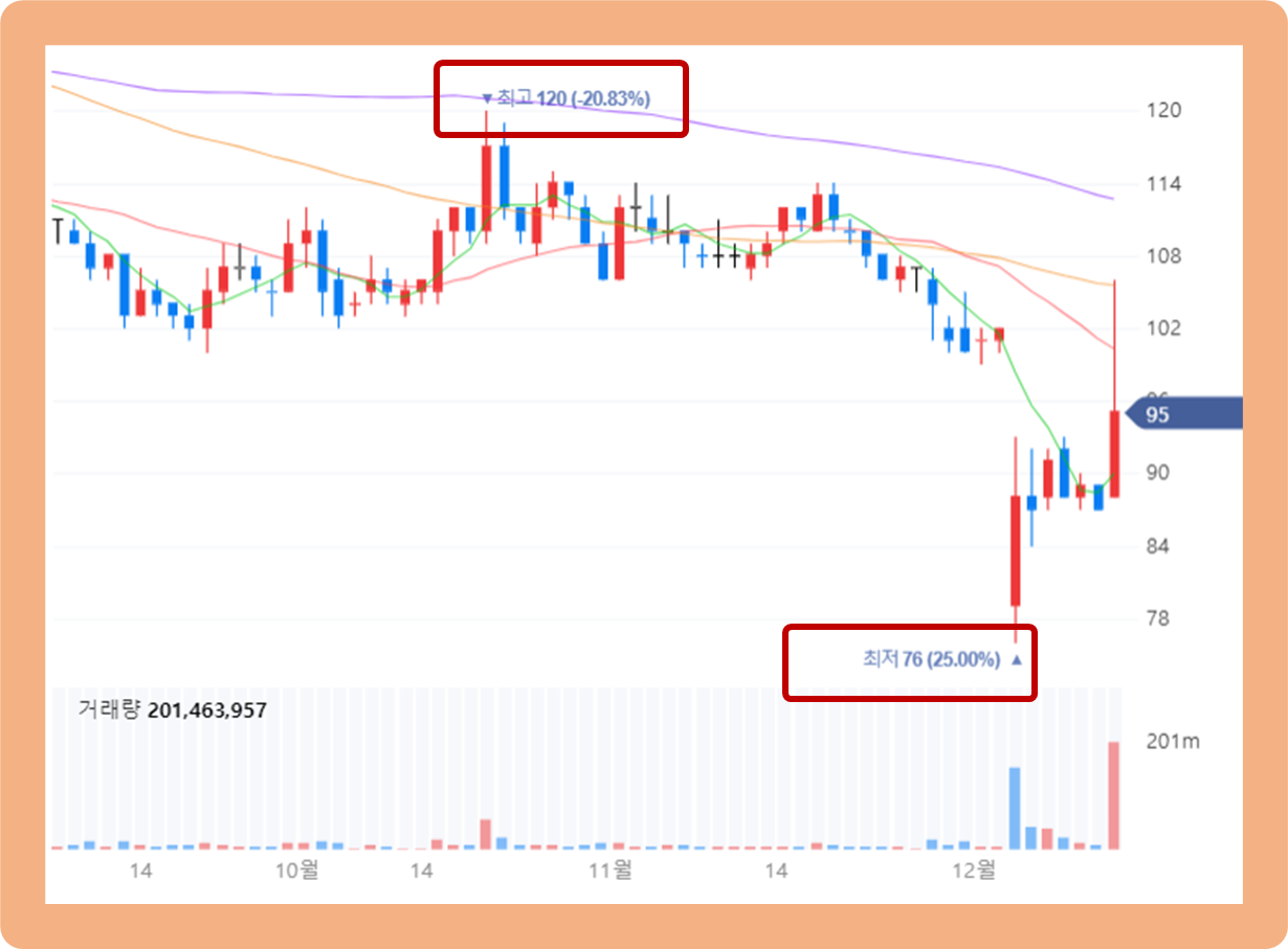 그 이후 주가는 하락세가 지속되면서 12월 3일 최저 76원까지 떨어졌습니다.