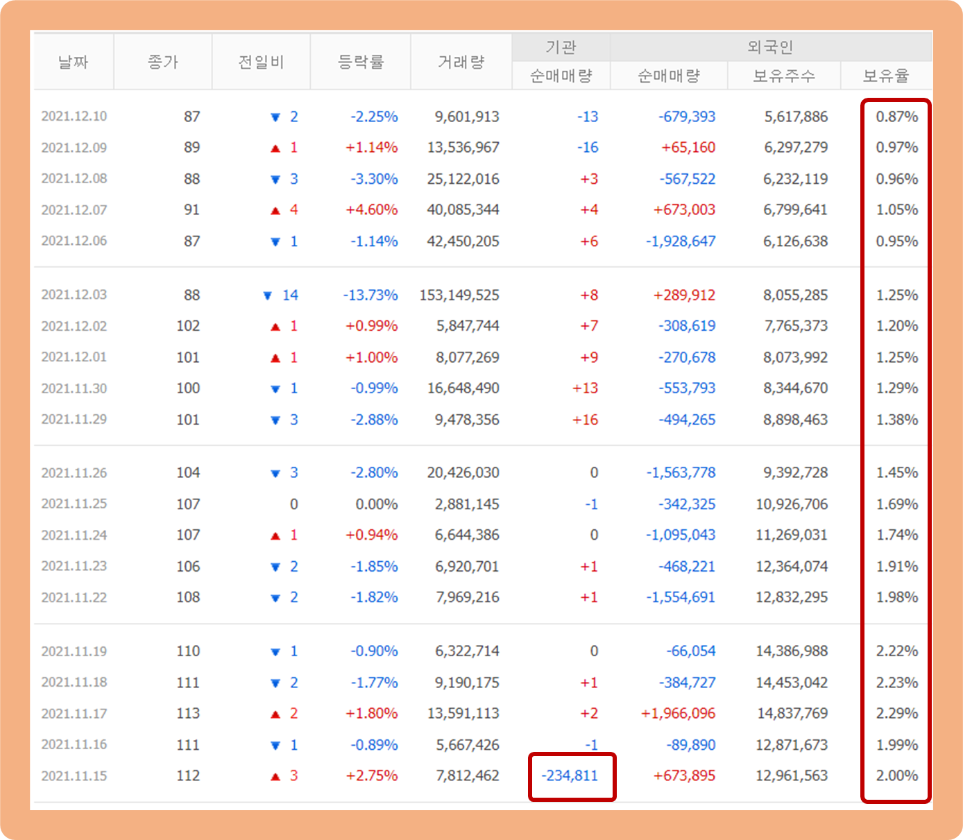 기관투자자의 경우를 보시면, 최근 한 달간 거래량이 거의 없으며 지난 11월 15일에는 대량 매도가 발생한 바 있습니다.