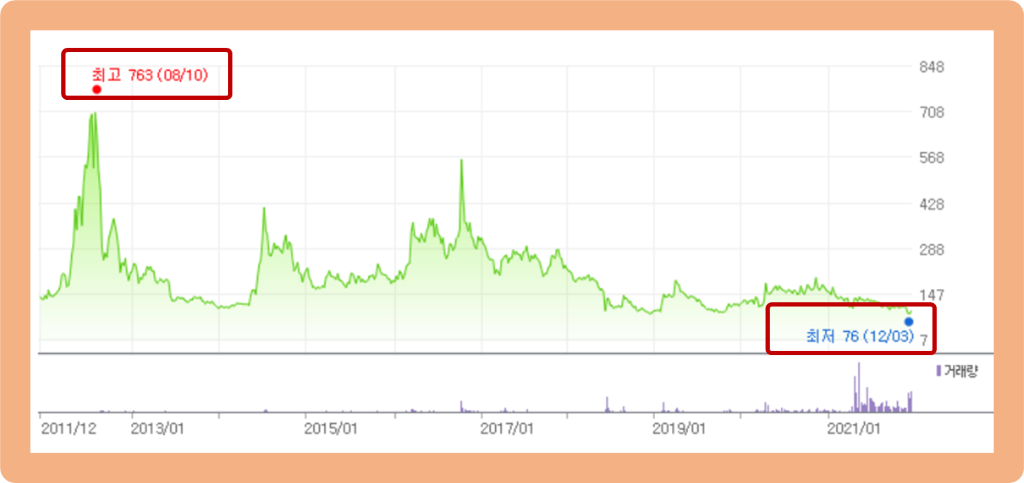최고가는 2012년 8월에 기록한 763원이며, 최저가는 2021년 12월에 기록한 76원입니다.