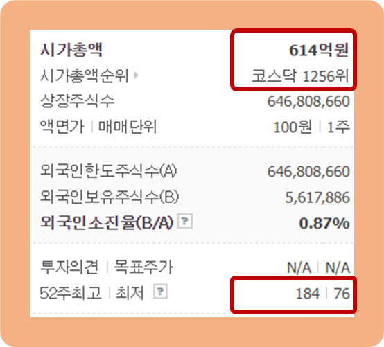 52주 최저가는 76원이고, 52주 최고가는 184원이네요.