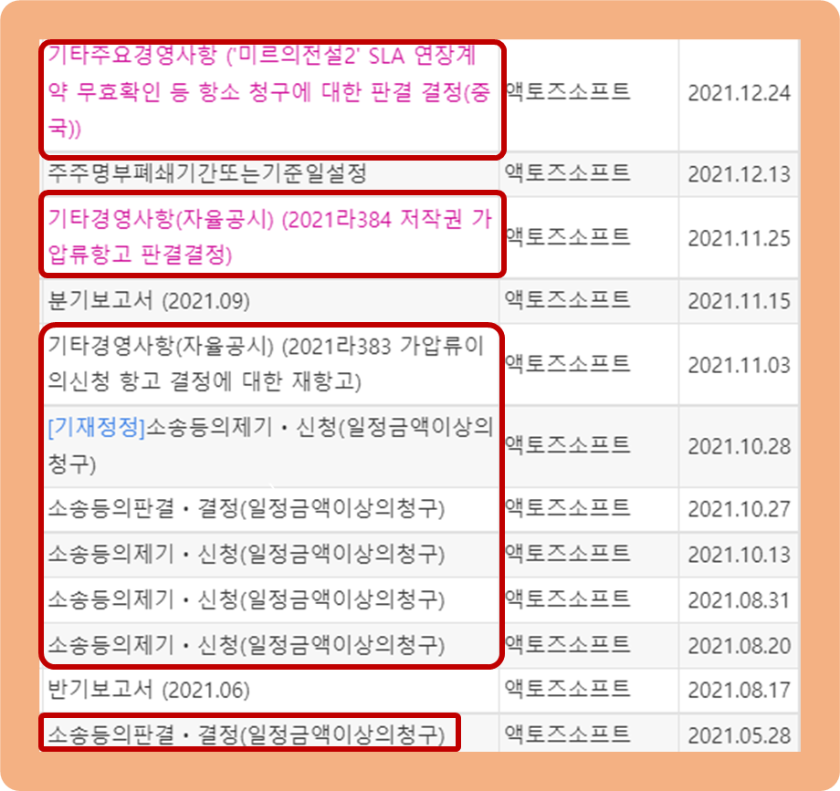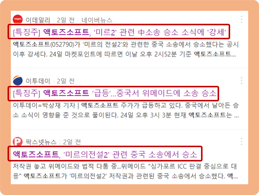 2021년 2월 24일, 액토즈소프트가 공시를 통해 미르의전설2 소프트웨어 라이선스의 연장계약 무효 확인 관련 소송 최종심에서 위메이드 및 전기아이피의 소송 청구를 기각한다는 판결을 받았다고 발표했습니다.