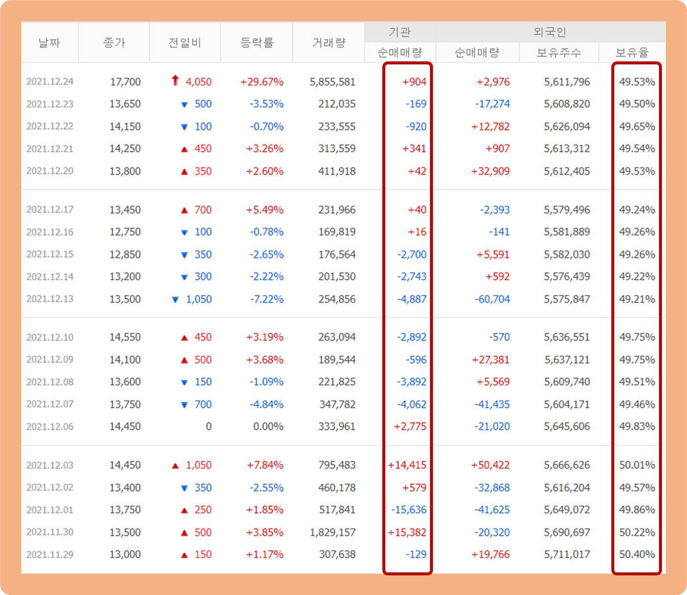 외국인 투자자 지분율의 경우, 지난 한 달 동안 약 49~50% 수준을 유지하고 있네요.