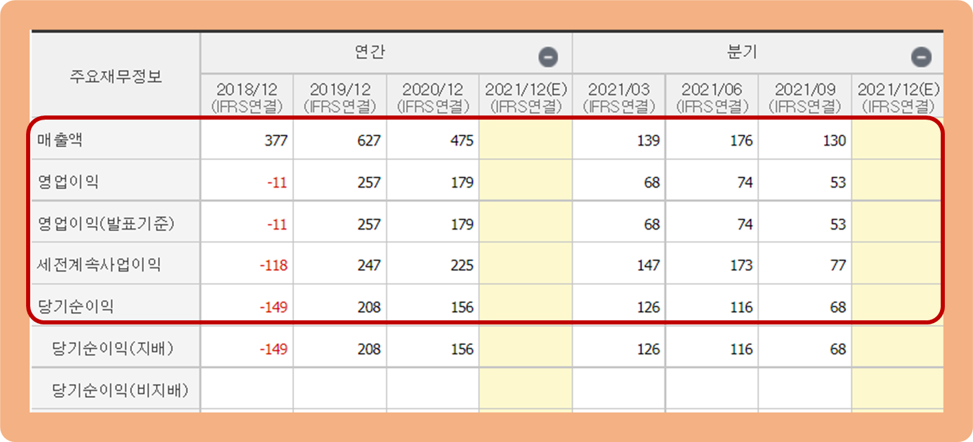 그리고 2021년 3분기 누적 실적을 보면, 올해에도 흑자를 이어나갈 것으로 보이며 순이익은 2020년 대비 상승이 예상되네요.
