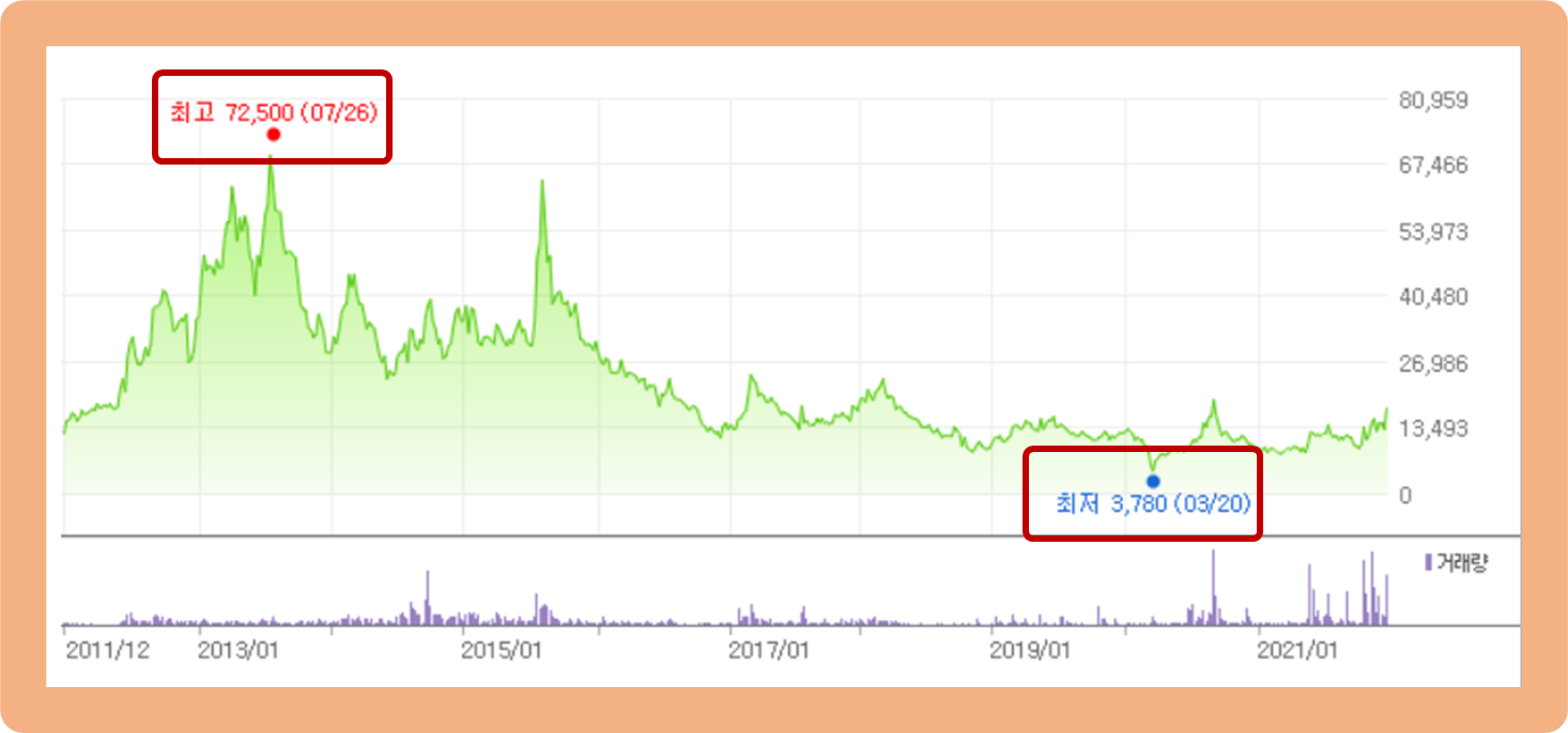 최고가는 2013년 7월에 기록한 72,500원이며, 최저가는 2020년 3월에 기록한 3,780원이네요.