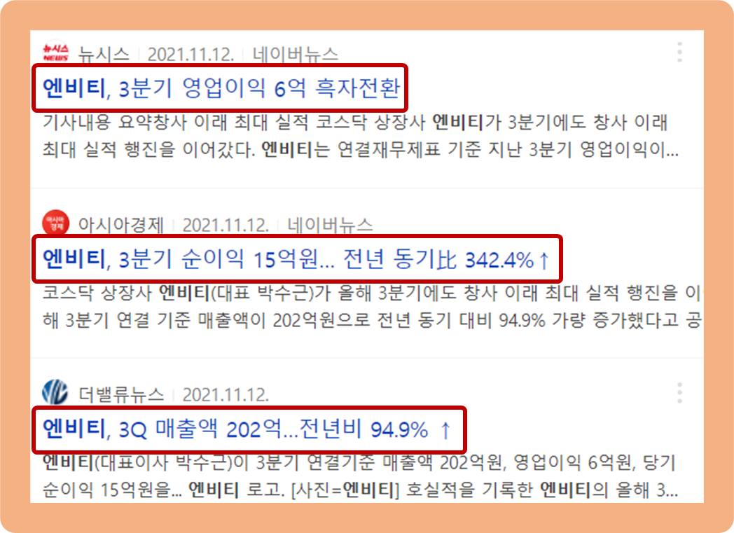 2021년 11월 12일, 엔비티가 2021년 3분기 기준 영업이익 6억원을 기록하면서 전년 동기 대비 흑자 전환에 성공했습니다.