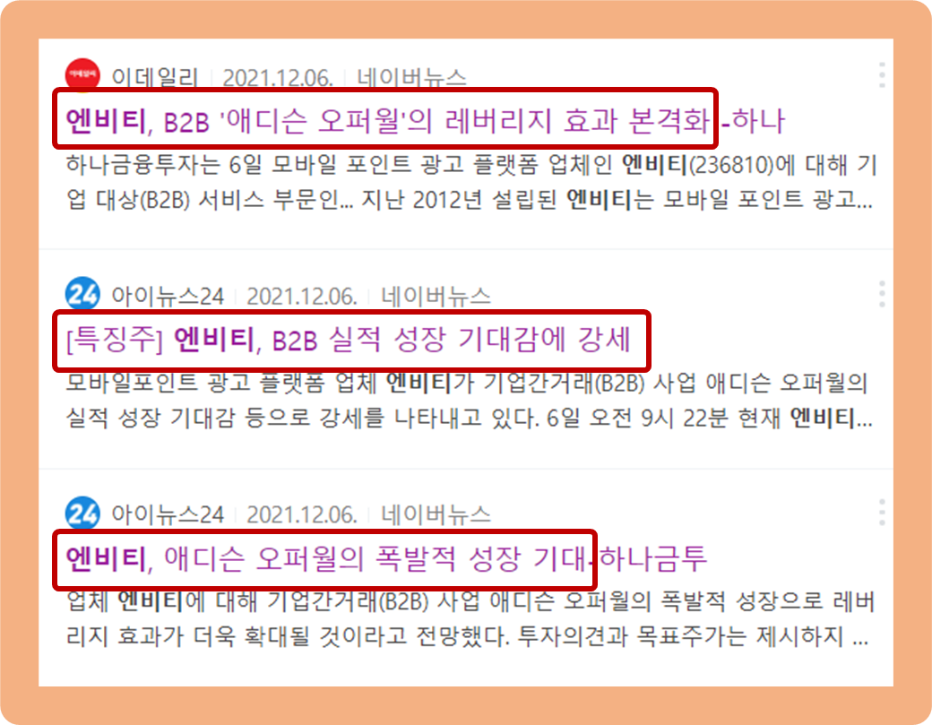 최근 엔비티의 B2B(기업 간 기업) 대상 서비스 부문인 애디슨 오퍼월이 급 성장을 보이고 있다고 합니다.