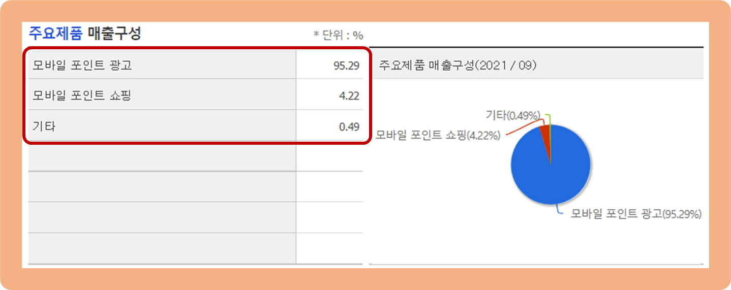 모바일 포인트 광고부문이 약 95.29%, 모바일 포인트 쇼핑 부문이 약 4.22%를 차지하고 있네요.