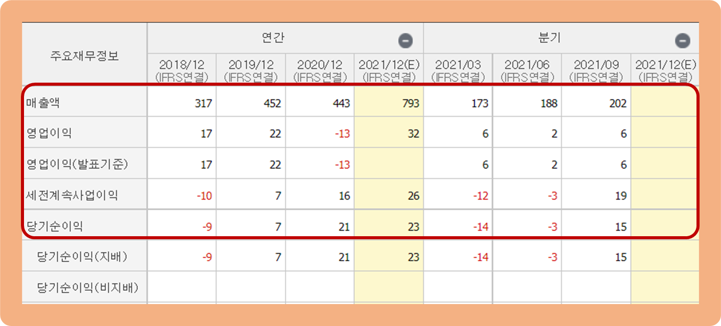 2021년 3분기 누적 실적은 현재 모두 흑자를 기록 중인 바, 2021년도에는 연간 매출액, 영업이익, 당기순이익 모두 호조세를 보일 것으로 전망되네요.