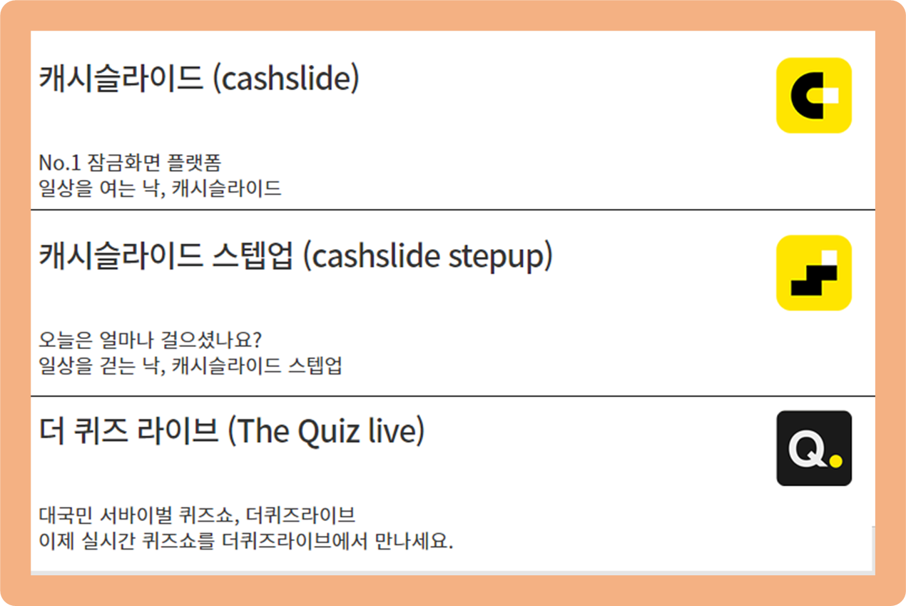 그리고 핸드폰 잠금화면 플랫폼인 캐시슬라이드를 출시하였으며, 핸드폰 잠금화면을 광고 영역으로 활용하며 고객에게 포인트를 제공해주는 사업모델을 구축한 기업이죠.