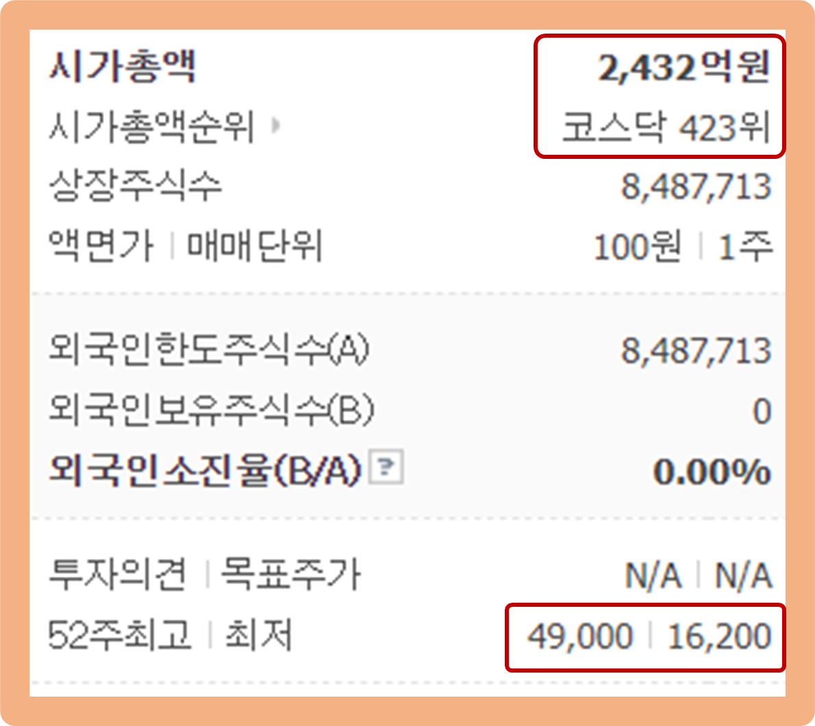 52주 최고가는 49,000원이며, 52주 최저가는 16,200원이네요.
