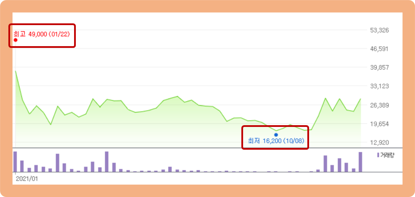 최고가는 2021년 1월에 기록한 49,000원이며, 최저가는 2021년 10월에 기록한 16,200원이네요.