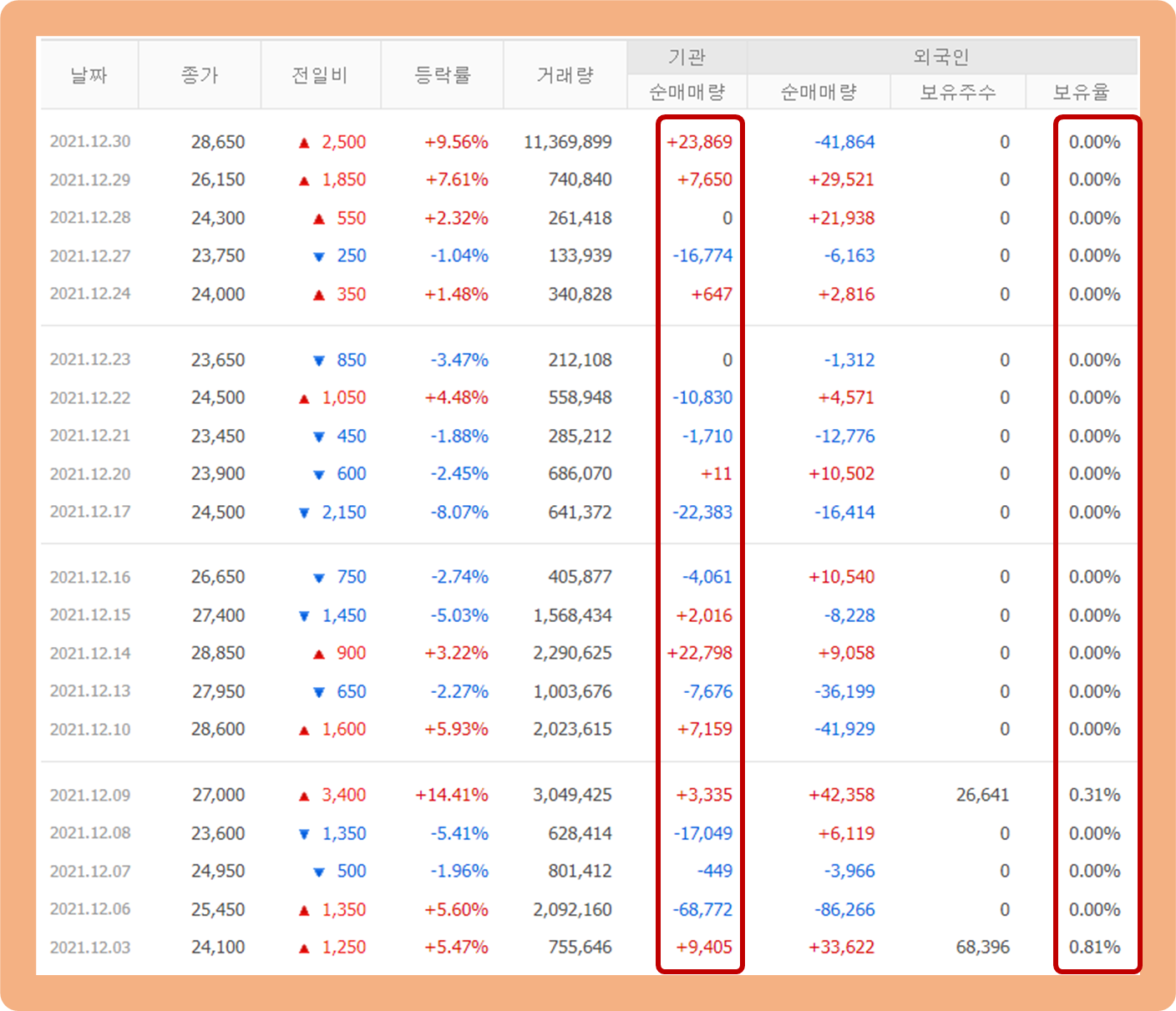 최근 1개월 동안 기관 투자자 및 외국인 투자자의 매매 추이를 살펴보도록 하겠습니다.