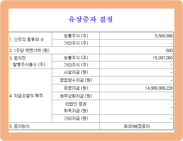 총 발행주식 수의 약 36.9% 수준인 5,569,996주가 신주로 발행되는 것이며, 발행가액은 2,693원이라고 하네요.