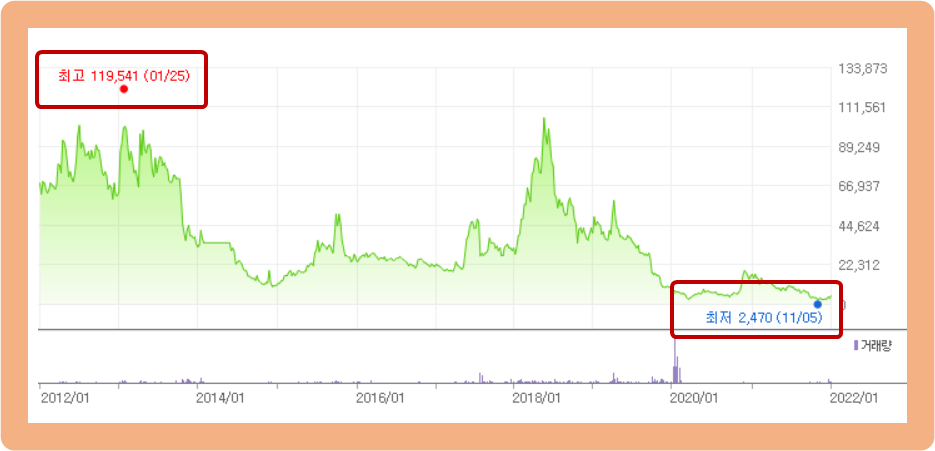 최고가는 2013년 1월에 기록한 119,541원이며, 최저가는 2021년 11월에 기록한 2,740원이네요.