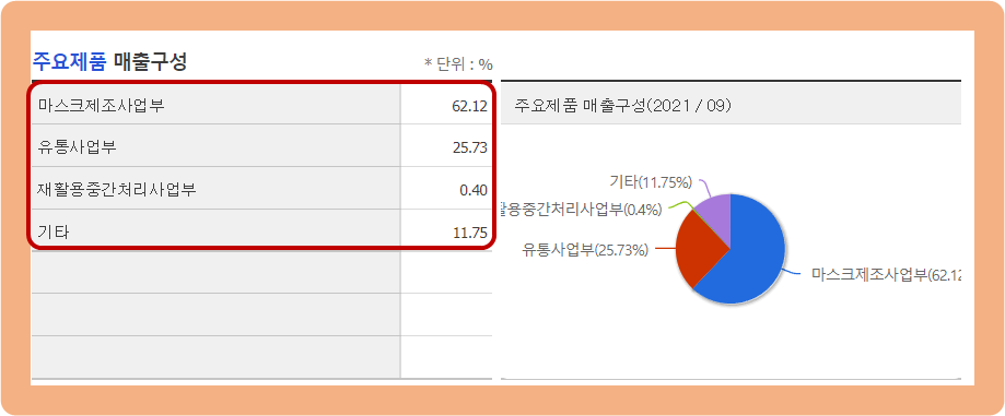 마스크 제조 사업 부문이 약 62.12%이며, 그 다음으로 유통 사업 부문이 약 25.73%를 차지하고 있습니다.