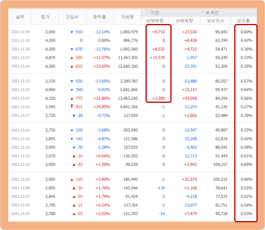 기관투자자의 경우, 지난 한 달 동안 집중적으로 매수세가 들어오고 있구요.