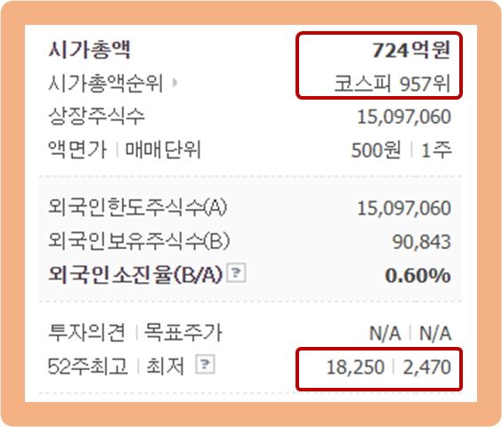 52주 최고가는 18,250원이며, 52주 최저가는 2,470원이네요.