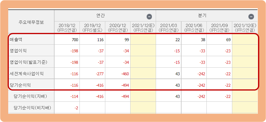 또한, 2021년 3분기 누적 영업이익과 당기순이익 모두 큰 폭으로 적자를 기록중인 바, 2021년 연간 실적도 적자 행진을 이어나갈 것으로 보입니다.
