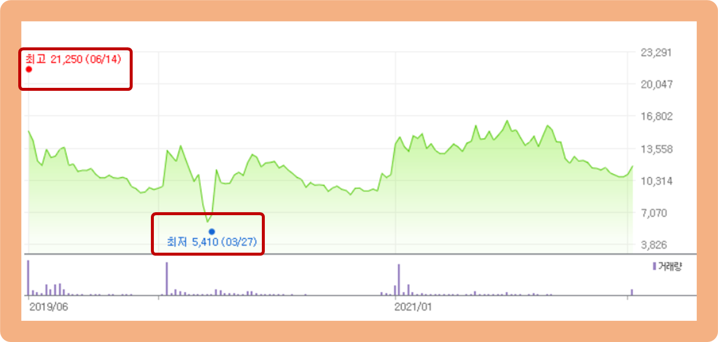 최고가는 2019년 6월 14일에 기록한 21,250원이며, 최저가는 2020년 3월에 기록한 5,410원입니다.