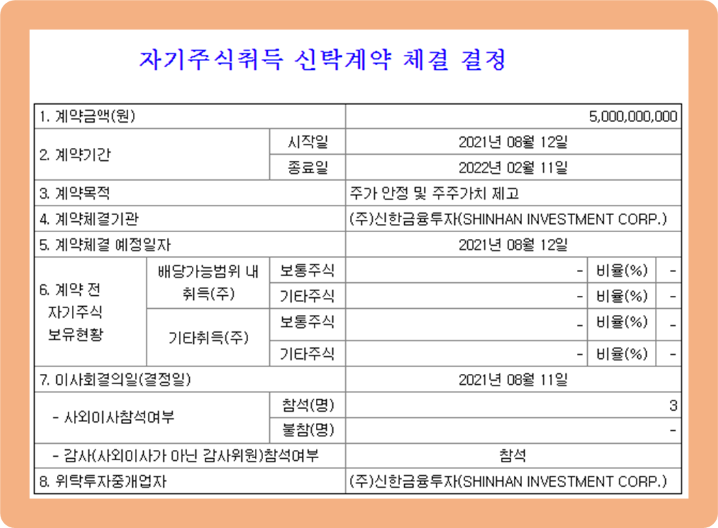 계약 목적은 주가 안정 및 주주가치 제고이며, 신한금융투자와 약 50억원 규모의 자사주 취득 신탁계약을 체결한 것이죠.