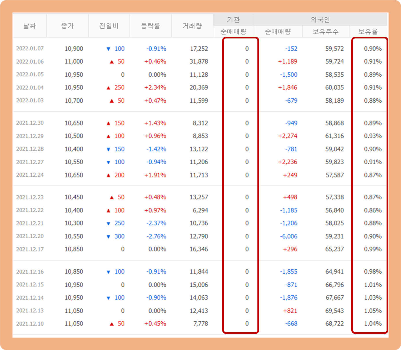 우선 기관투자자의 경우, 지난 한 달 동안 거래량의 거의 없었구요.