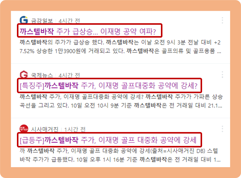 이 소식으로 인해 골프 관련주인 까스텔바작이 강세를 보이고 있는 것입니다.