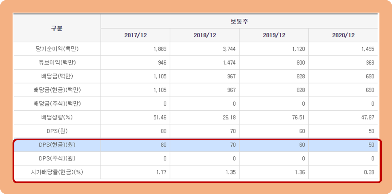 2017년 : 80원 / 2018년 : 70원 / 2019년 : 60원 / 2020년 : 50원을 지급하며, 매년 배당금이 줄어가고 있는 모습입니다.