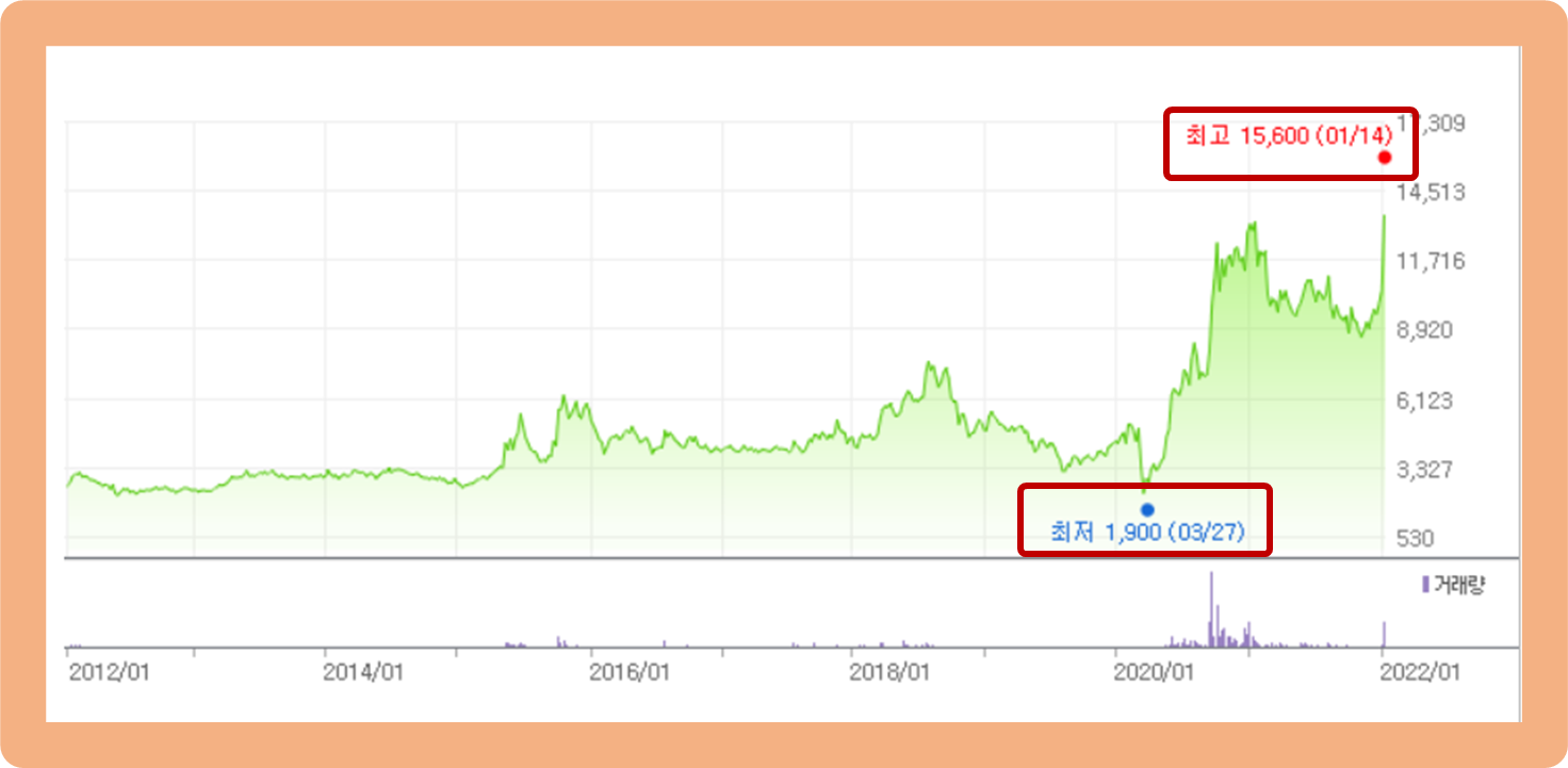최저가는 지난 2020년 3월에 기록한 1,900원이며, 최고가는 2022년 1월에 기록한 15,600원이네요.